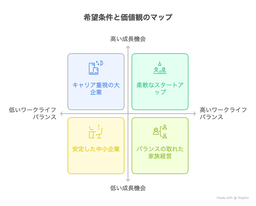 たとえば、ワークライフバランスを重視する人は、残業の少なさや柔軟な勤務体制を重視する必要があります。