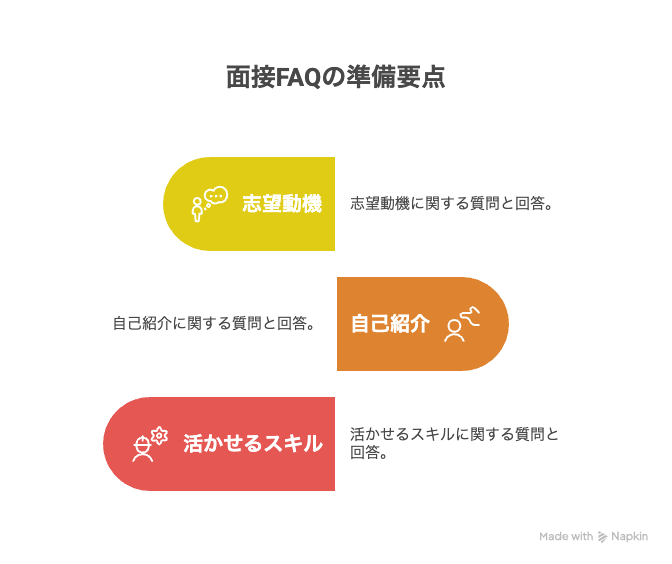ずばり「志望動機」「自己紹介」「前職の経験と活かせるスキル」です。これらに備えるには、質問ごとに要点を整理し、自分の強みを交えて答える練習をしておきましょう。
