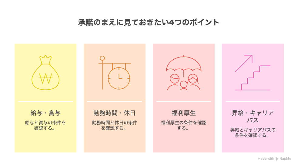 たとえば、昇進基準の明確さや研修制度の充実度なども確認すべきポイントです。不明点があれば承諾前に質問し、納得してから進めるのが重要です。